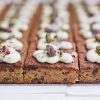 A soft fig and gingered flourless cake iced with a yoghurt cream cheese icing, pistachios & dried flowers. (This slab size can be cut on request into 45 pieces) Approx size: 37 …
